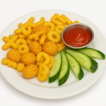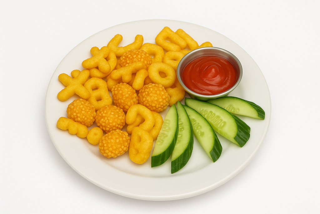 ☻ 9 vnt. su bulvių „raidelėmis“, padažu ir šviežiais agurkais.